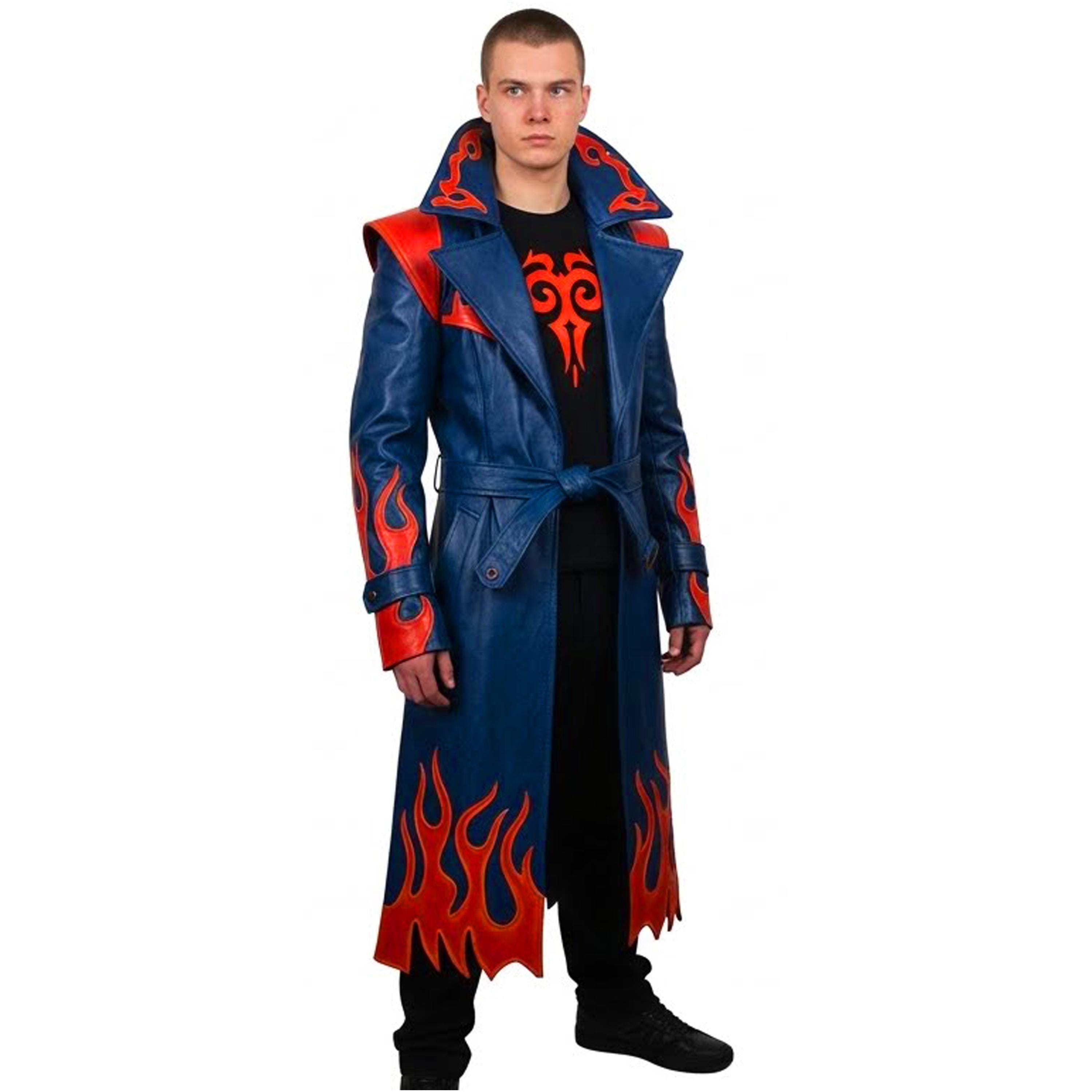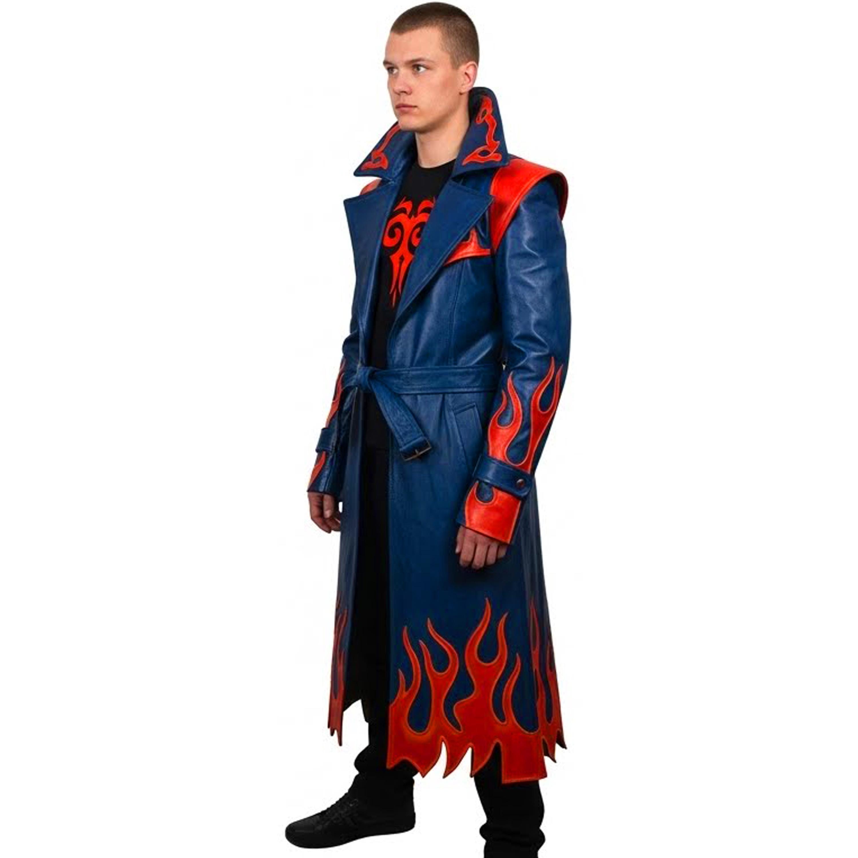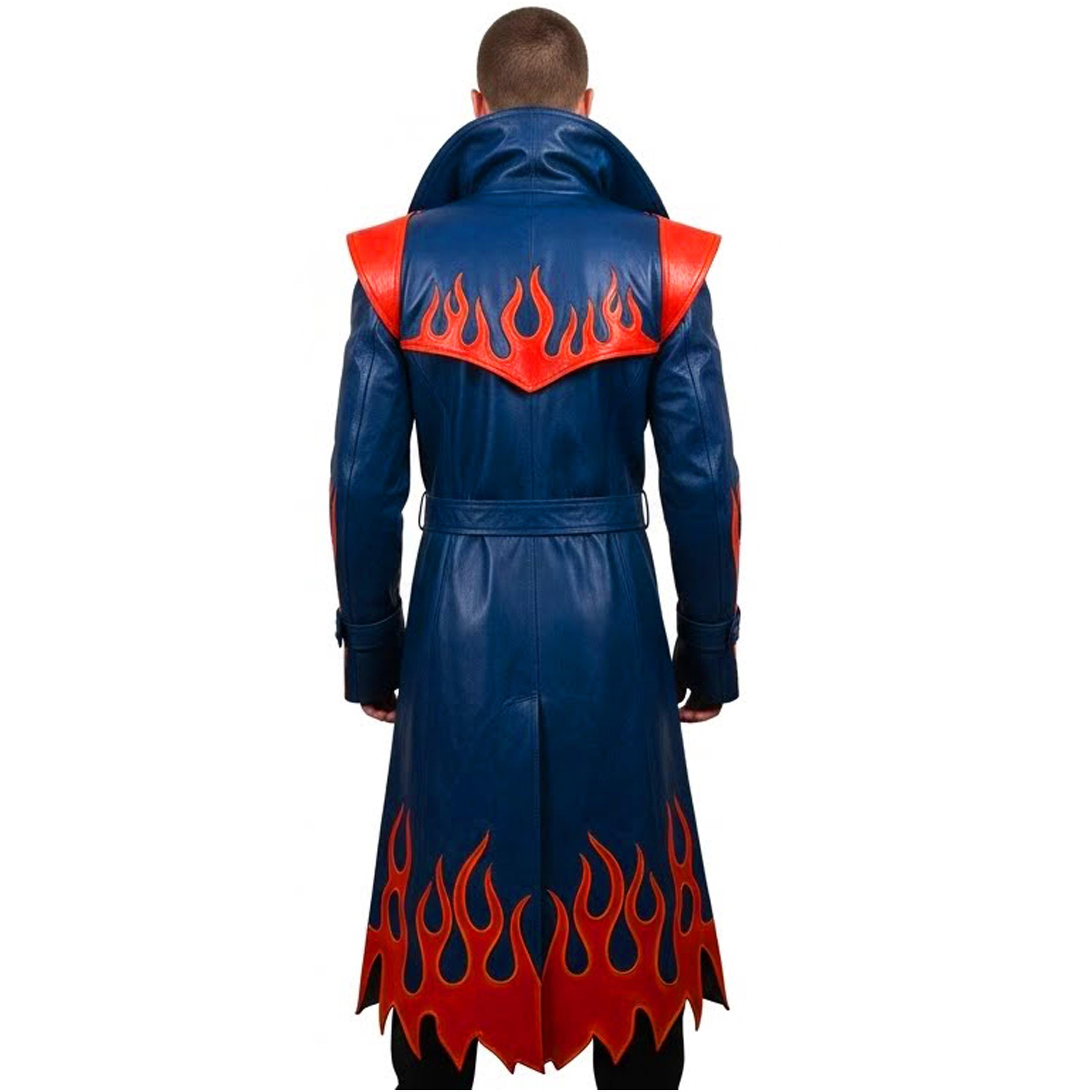Step into the spotlight with our Handmade Blue Leather Trench Coat, featuring vibrant Red Flame details that command attention. Whether you are hitting the main stage at Comic-Con as a legendary Devil Hunter or looking to dominate the urban landscape with edgy, gothic streetwear, this coat is your ultimate statement piece.