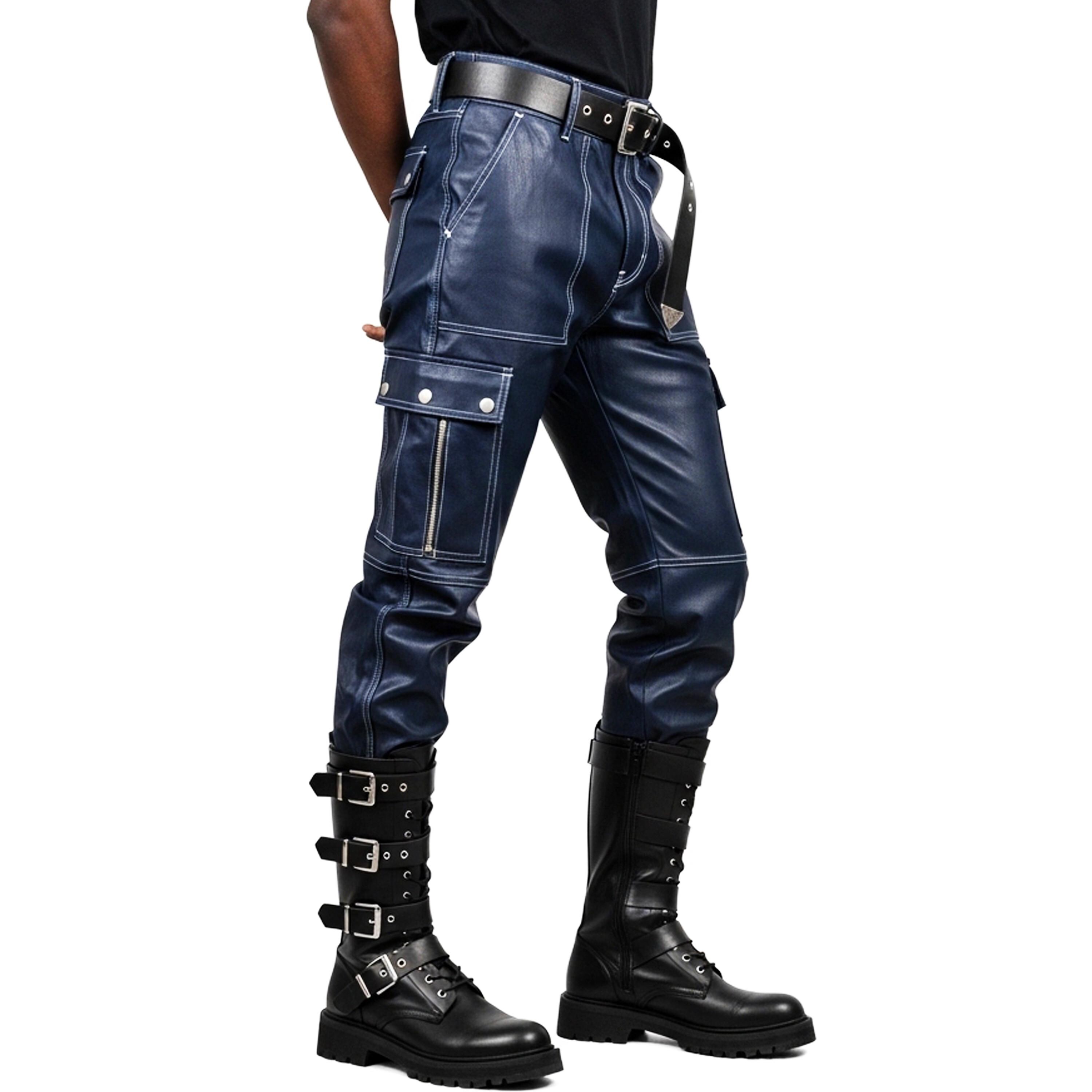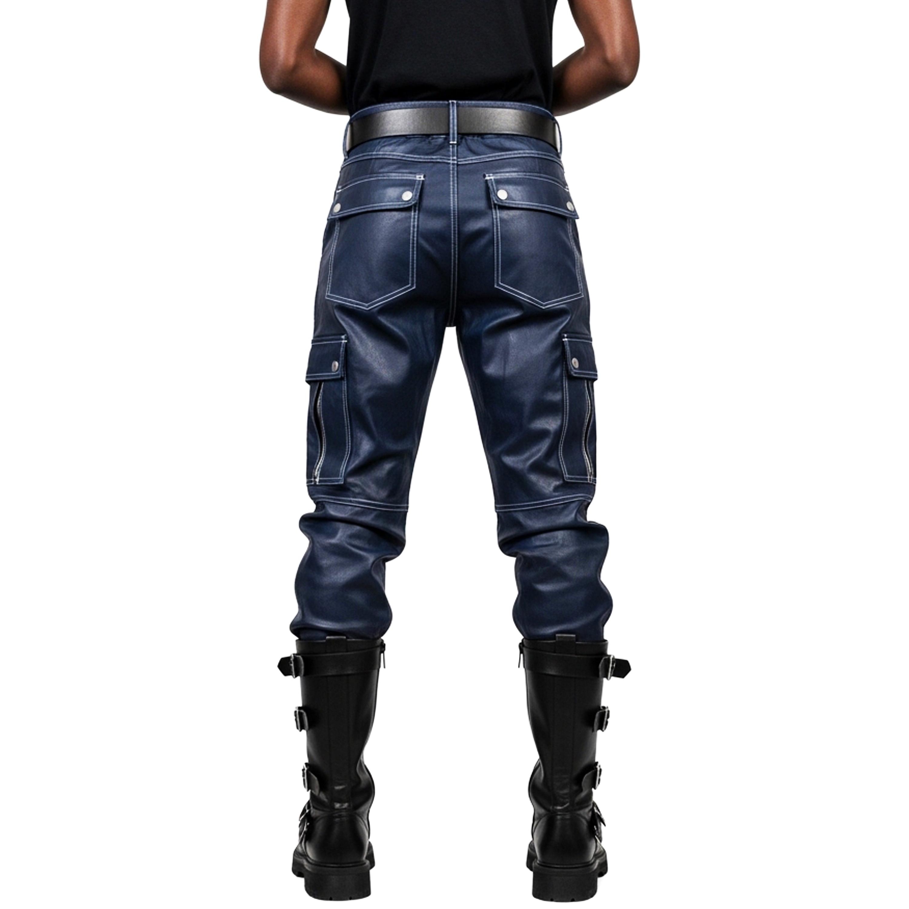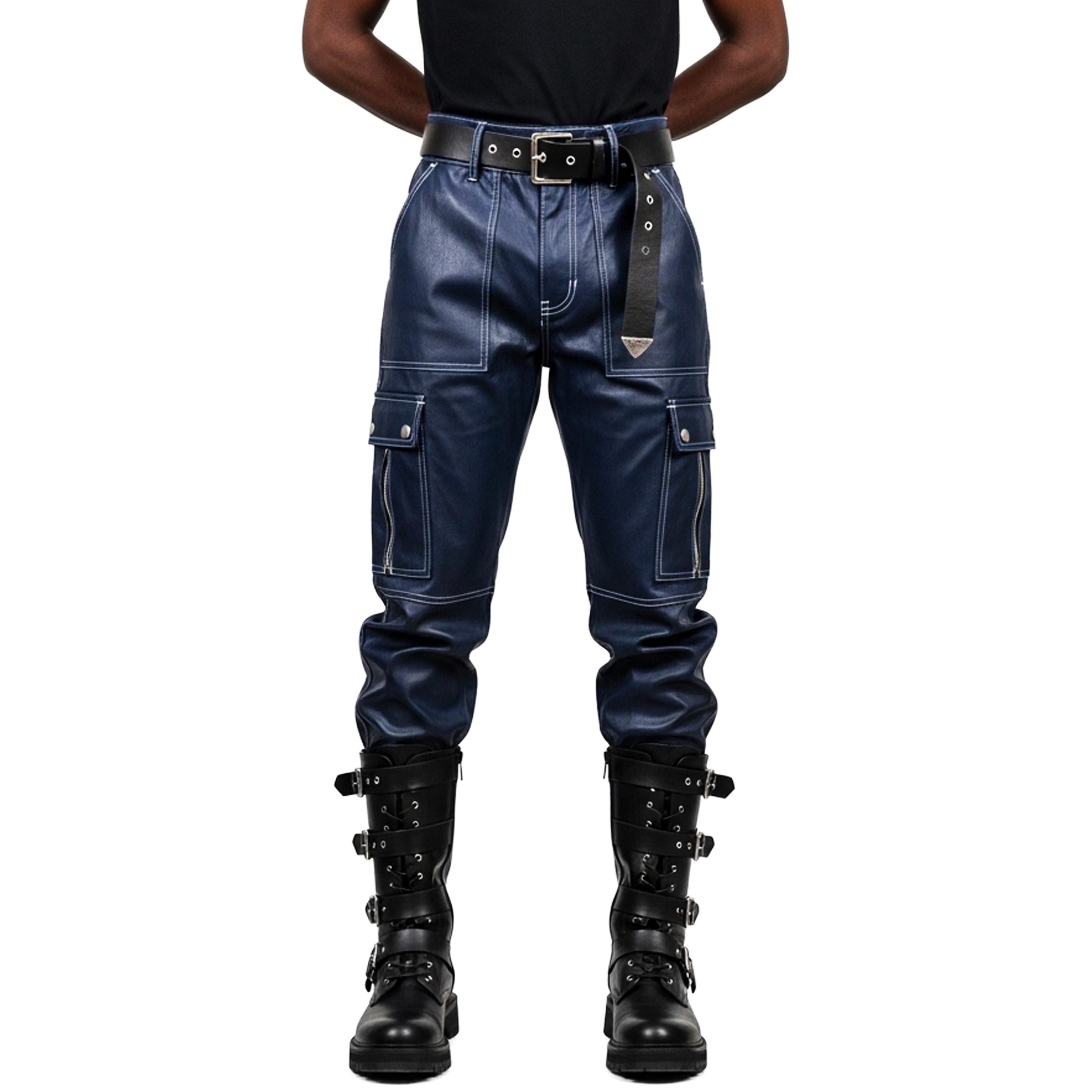 Level up your street style with these premium Navy Blue Leather Cargo Pants. Expertly handcrafted for those who demand a fusion of rugged utility and high-fashion aesthetics, these trousers are the ultimate statement piece. Featuring a striking deep navy blue finish with high-contrast white stitching, these pants bridge the gap between Cyberpunk techwear and classic biker gear.